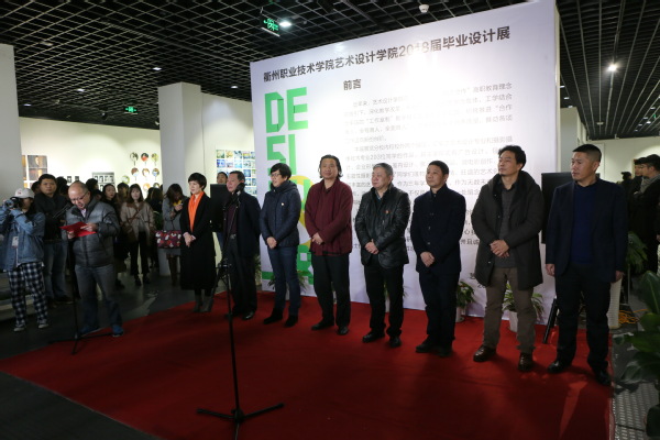 1月18日下午,艺术设计学院2018届毕业设计展在衢州市文化馆隆重开幕。衢州市文联主席欧阳建华,校党委书记崔戴飞、纪委书记章加春,衢州市教育局艺术教育委员会副主任委员翁胜华、艺术设计学院院长叶云龙、党总支书记徐有强,衢州市装饰装修行业协会副秘书长鲍金炎,衢州市灵动广告有限公司总经理孙操、衢州市玖佳装饰设计工程有限公司总经理刘宣蓉、以及衢州市美术家协会、衢州学院等单位代表、艺术设计学院师生出席了开幕式。