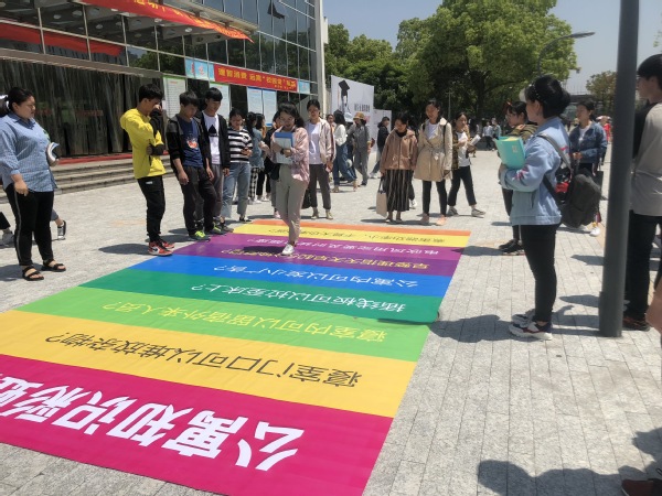 “煮蛋器功率小,不算大功率电器?”、“寝室门口可以堆放杂物?”、“电吹风用完要及时拔离插座?”、“寝室内可以留宿外来人员?”……这些公寓相关知识组成了彩虹色的“台阶”,参与同学需一步一答,答对一题,踏过一个“台阶”。现场气氛活跃,同学们积极参与。