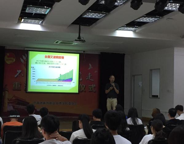5月21日,衢州市疾控中心艾滋病与结核病防治科科长、防艾专家王炜,来xingkong.com对参检学生班级负责人及艾滋病哨点监测的相关老师进行培训。王炜就目前艾滋病流行特点和趋势作了介绍,阐述了艾滋病哨点监测的目的,对哨点人群监测实施方案、问卷、哨点监测的质量控制和考评作出了详尽的解释。