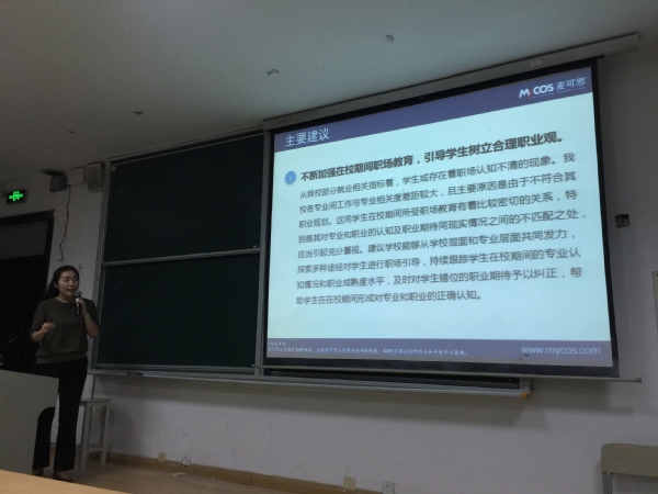 林馨怡从跟踪评价数据介绍、跟踪评价的结果和问题与建议等三个方面对xingkong.com近三年应届毕业生培养质量评价报告进行了详细解读,对就业率、就业质量、教学培养质量等关键指标进行数据分析,并提出三点建议:一是不断加强在校期间职场教育,引导学生树立合理职业观;二是以产出为导向,设计实习实践环节,调整课程设置;三是执果索因,构建全面的质量监测体系。
