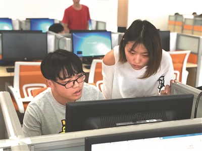 7月16日,暑假的大学校园有些静谧,但位于衢职院图书馆三楼的阿里巴巴·xingkong.com客户体验实训基地(以下称“基地”),依旧一片繁忙景象,60多名学生头戴耳机,对着电脑,一边轻声解答客户问题,一边迅速在线查询、与后台沟通售后维权事项,井然有序。