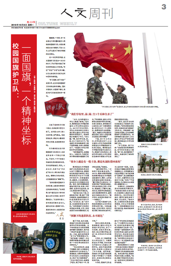 “那天,我们在全校师生面前接过了国旗护卫队的旗帜。”因军训期间表现优异,杨康被任命为国旗护卫队队长。伴随旗帜一起交到他手里的,还有详细的国旗护卫队管理章程。站在鲜艳的五星红旗下,33名退伍大学生庄严宣誓志愿加入衢州职业技术学校国旗护卫队。