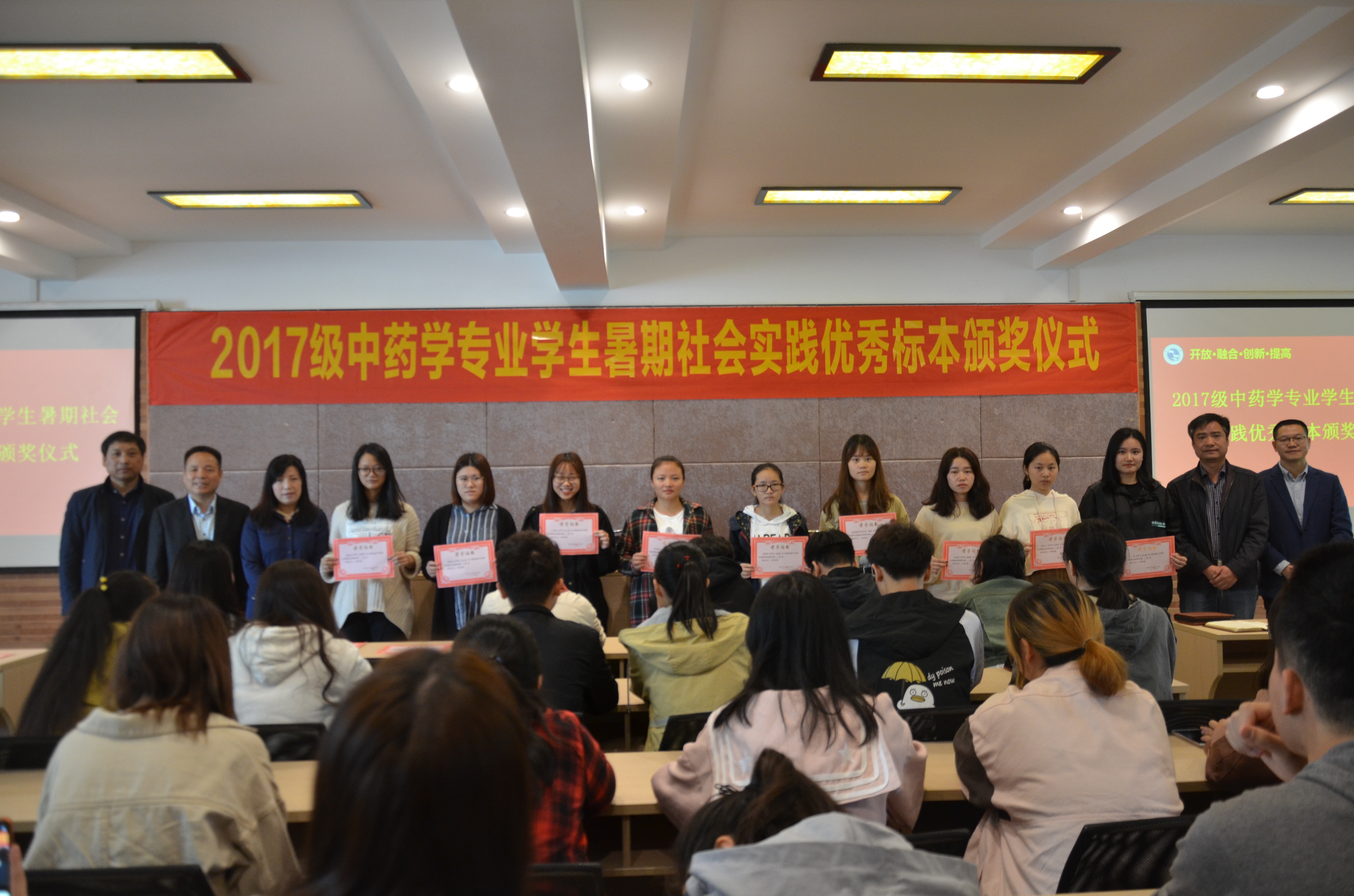 为表彰和展示17级中药学专业学生暑期社会实践成果,医学院于10月24日上午,在医学实训多功能厅举行17级中药学专业学生暑期社会实践优秀标本制作颁奖仪式。副校长傅元勋、医学院院长姚水洪、党总支书记余文富、副书记周贞、副院长吴忠勤和中药学专业团队参加了本次颁奖仪式。仪式由吴忠勤主持。