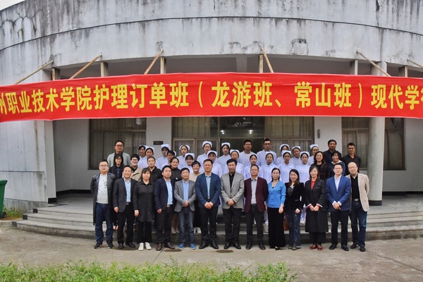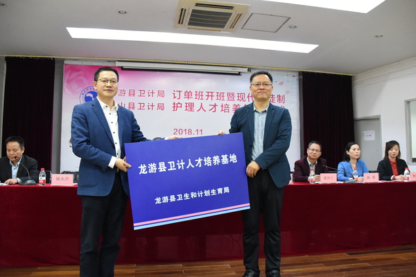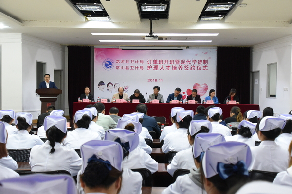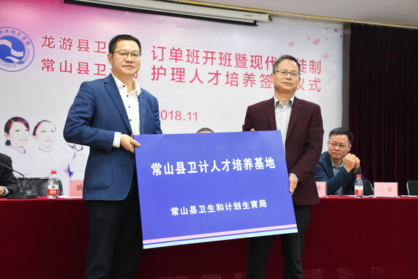 11月7日下午,2018级“龙游班”“常山班”开班暨现代学徒制护理人才培养签约仪式在xingkong.com艺术楼多功能厅举行。副校长黄云龙、龙游县卫计局局长丁俊、副局长张永华、常山县卫计局副局长黄兴土、龙游县人民医院党总支书记、副院长杨瑾、常山县人民医院保健教育科科长徐瑾鼎等领导参加签约仪式,仪式由医学院党总支书记余文富主持。
