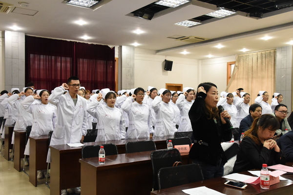 仪式开始,医学院院长姚水洪和两家合作单位主管领导分别作了发言,会上双方签订了订单班护理人才培养协议、就业意向书和师徒确认书等相关合作协议,并授牌“卫计人才培养基地和现代学徒制护理人才培养基地。在场订单班的全体学生在赖晓华老师的带领下庄重的宣誓,表达了对护理事业的热爱与忠诚。