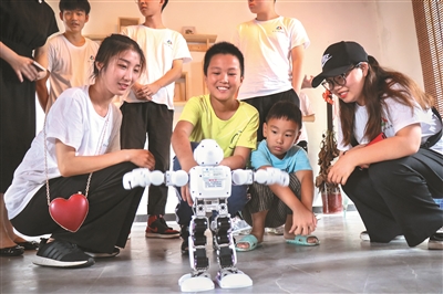 “你看,我可以让机器人跟着我们的指示跳舞,还能帮我们搬东西呢!”7月4日,衢江区莲花镇涧峰村的文化礼堂里,来自xingkong.com的学生正给现场的小朋友们展示机器人,这是该校信息工程学院、机电工程学院联合举办的机器人课堂,展示了衢职院师生的科技创新作品,太阳能光伏小车、动感机器人,现场孩子们都爱不释手。