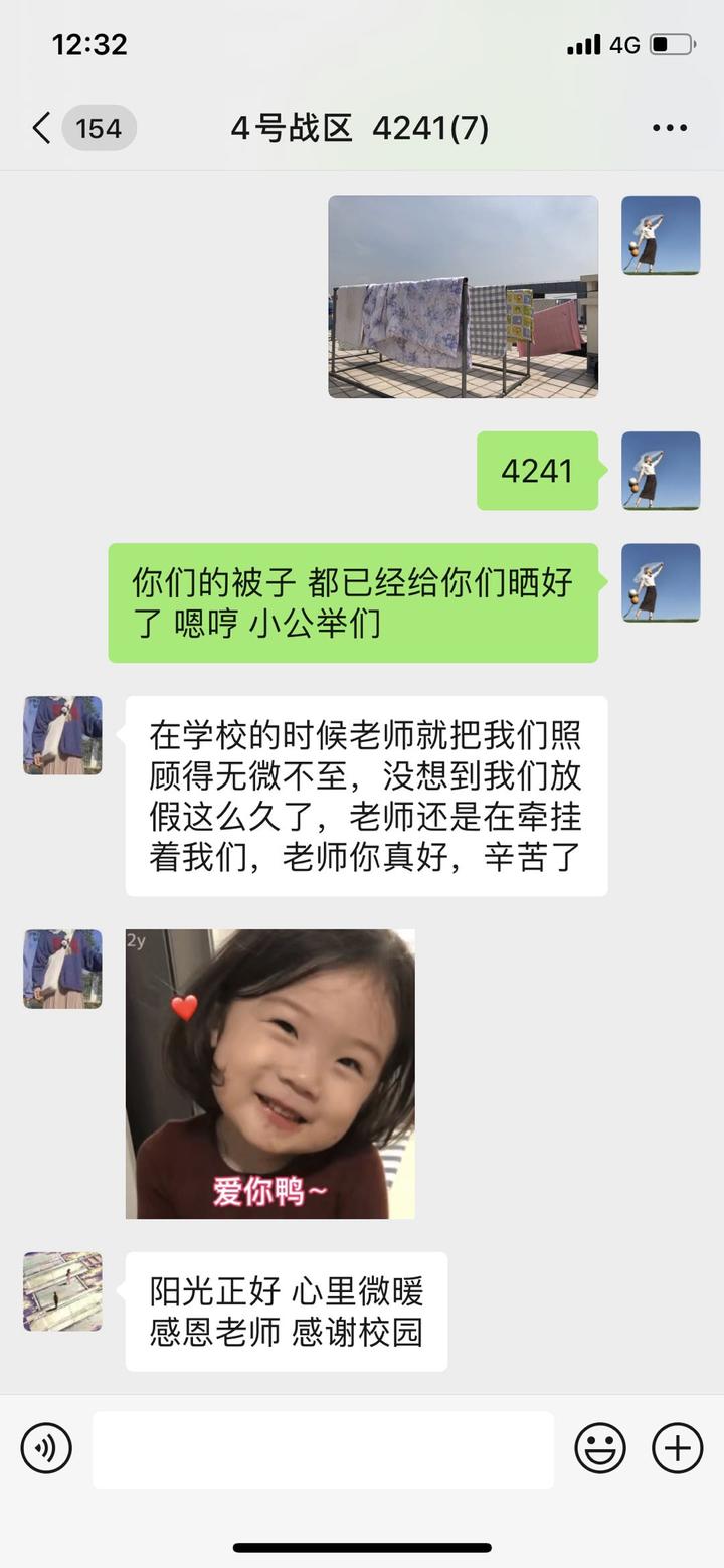小小的举动促进了师生之间的良好互动,把教育浸润在日常生活的关心关爱里,凝聚起了思政教育更加强大的亲和力、穿透力和感召力。在老师们潜移默化、不断优化学校育人环境的过程中,在默默给予学生更多的人文关怀的时候,学生们也给予老师真情的反馈,“在学校的时候老师就把我们照顾得无微不至,没想到放假了,老师还牵挂着我们,谢谢你......”了解到有些联系老师一个人跑了五六趟才把同学们的被子晒好,经济管理学院学工办主任蒋雪芬甚至还磨破了脚,但看到同学们在群里给老师留言点赞,她却倍感充实和欣慰,“现在能为学生做的就是帮他们营造一个干净整洁有序的校园环境,等待朗朗书声回归校园,期待相见。”