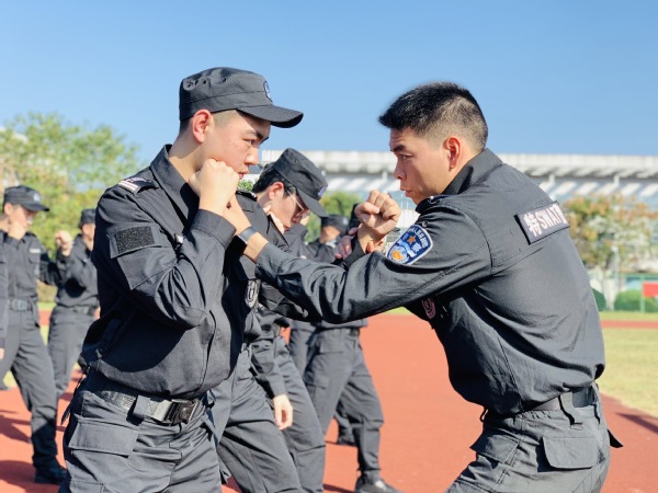 近日,xingkong.com辅警班首批新生走上操场,真刀真枪地上了一堂基础技能课。衢州市公安局特警支队作训科科长程腾作为特派教练还现场示范,手把手教他们徒手格斗技巧。图为上课场景。