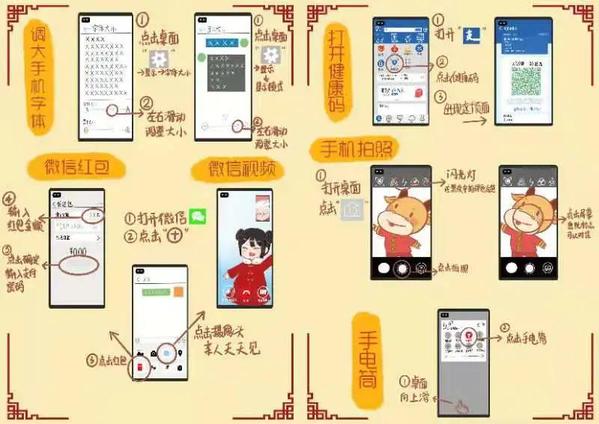 这份《老年人智能手机实用指南》是衢职院学生会的同学们花了两天时间,用平板电脑手绘完成,内容包括如何调出健康码,如何将手机字体调大,手电筒如何使用,如何用手机拍照,用微信发红包、视频通话等。