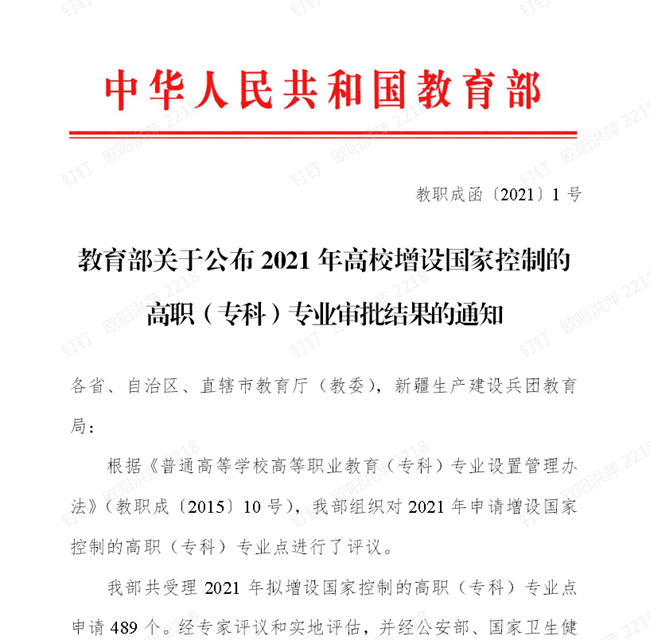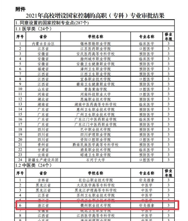 近日,教育部下发《关于公布2021年高校增设国家控制的高职(专科)专业审批结果的通知》(教职成函〔2021〕1号),衢职院申报增设的针灸推拿专业,经专家评议和实地评估,并经国家卫健委、国家中医药管理局等行业主管部门审核,教育部审批同意增设。2021年开始面向普高类招生。针灸推拿国控专业获批实现了衢职院升格高职办学以来的重大历史性突破,为“十四五”发展开篇谋局,更高标准推进省高水平专业群建设,更高水平服务地方经济社会发展,奠定了良好基础。