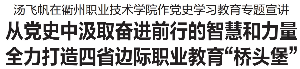 当天上午,xingkong.com图书馆报告厅座无虚席。在近两个小时的宣讲中,汤飞帆围绕“全面了解和把握党的光辉历程和历史性成就、把学习党的百年历史与学习党在衢州的奋斗史有机结合起来、从党史中汲取奋进前行的智慧和力量”三个方面,与广大师生进行交流。他以“主题主线与主流本质、四个历史时期、‘1234’的辉煌成就”三组关键词,全面系统梳理了党史学习的整体架构;从“新民主主义革命时期、社会主义革命和建设时期、改革开放和社会主义现代化建设新时期、中国特色社会主义新时代”四个时期,运用大量生动事例、详实数据,深入阐述了党在衢州的奋斗历程。汤飞帆强调,要把党史学习教育与学习贯彻习近平总书记对职业教育工作的重要指示精神结合起来,进一步坚定中国特色社会主义道路自信、理论自信、制度自信、文化自信,坚定对衢州未来发展的自信,坚定对职业教育的自信。