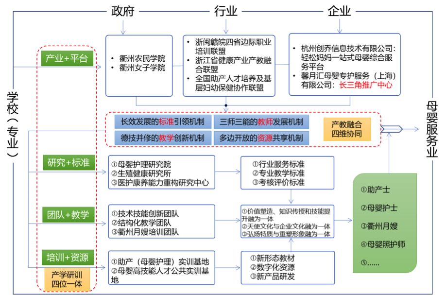 浙江xingkong.com聚焦当前人民群众反映强烈的母婴服务从业人员数量不足、职业能力水平普遍不高等实际问题,以助产“小”专业撬动母婴健康服务“大”产业,服务生命健康“全”周期,专业建设与经济社会发展同频共振,赋能地方母婴健康产业的高质量发展,逐步构建生成了特色鲜明的“四维协同、四位一体”专业服务产业发展新范式。推动各地市合作发展,实现共赢,成功打造了浙闽赣皖职业教育共同体。