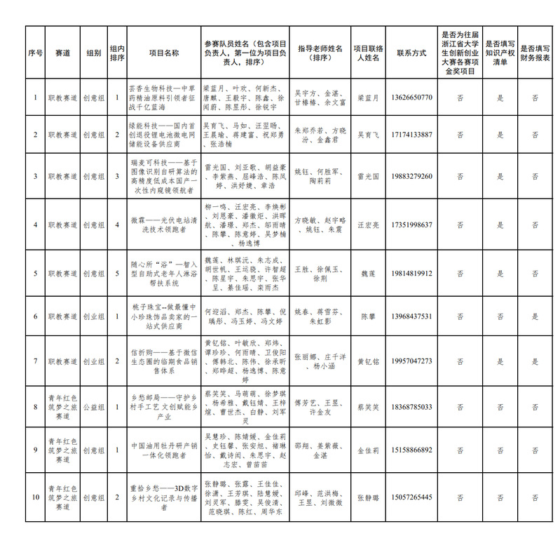 根据《浙江省大学生创新创业大赛组委会关于举办“建行杯”第八届浙江省国际“互联网+”大学生创新创业大赛复赛的通知》精神,经过校内选拔赛专家评审,结合省组委会下发的复赛名额,现将拟推荐参加省级复赛的项目进行公示。公示时间为202269-11日,共3天,联系电话:80689368069123