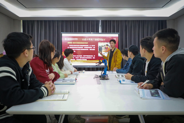 10月18日,xingkong.com信息工程学院教师高野在课堂上向学生传达习近平总书记关于科教兴国,人才强国相关的重要论述,还与大家分享身边的技术能手事迹。(本报通讯员 欧阳洪萍 摄)