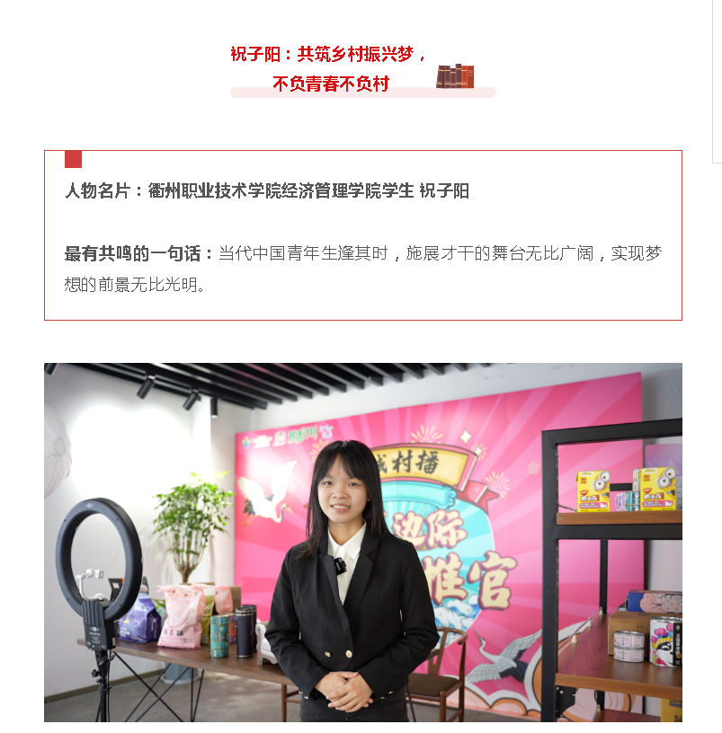 由于本身对直播行业十分感兴趣,上学期我参加了xingkong.com和柯城区村播产业专班主办的“四省联萌它力无限”四省边际大学生直播创业大赛并被选拔到直播基地学习和实践。在学校+实践基地的双边培养模式下,我逐渐积累直播经验并且明确了职业发展方向,内心更加坚定了自己选择的职业道路。我将不负国家对青年大学生的期待,努力学习相关知识,做好本职工作,把握时代机遇。