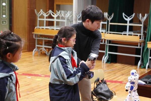 近日,xingkong.com机电工程学院第三党支部为衢州市实验学校教育集团菱湖校区四年级学生,开展了一场别开生面的科技节科普专项活动。本次活动主题为“小小工程师”,活动内容由机械花开、数字化技术、动力小车和格斗机器人四大模块组成。图为全国技术能手邵思程老师为小学生们展示3D扫描技术,邵老师介绍数字化设计与制造技术在运20飞机中的应用,小学生们跃跃欲试,与邵老师互动完成机器人的扫描与建模。