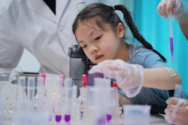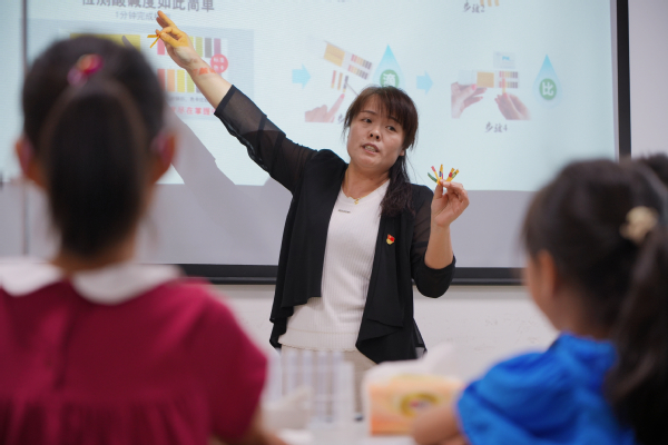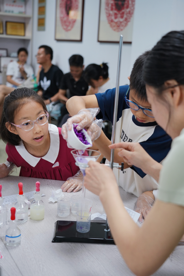 “这次化学课,选用紫甘蓝、五洁粉、肥皂水等作为教学原材料,贴近生活又安全有趣。如果学员们感兴趣,回家自己也能继续做实验。”牛瑞霞相告,课程从浅入深,从生活到科技再回归生活,希望能调动青少年对化学学科的好奇与兴趣。