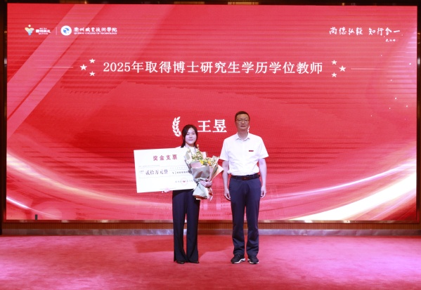 吕延文为2025年取得博士研究生学历学位的艺术设计学院教师王昱颁发奖励并赠送鲜花。