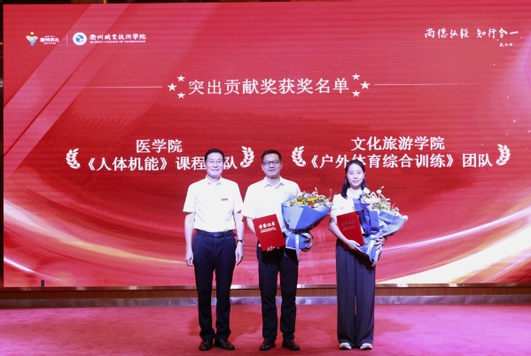 徐须实为“2025年度学校突出贡献奖”获奖团队,“职业教育国家在线精品课程(《人体机能》课程团队)”“2024年浙江省高职院校教学能力比赛一等奖且入围推荐国赛作品(《户外体育综合训练》团队)”颁发证书。