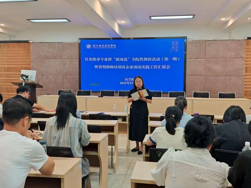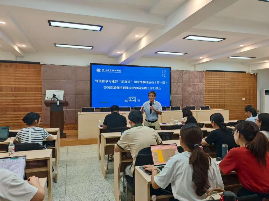 为深入贯彻落实“新双高”建设任务,推动课程教学改革与创新,提升教师教学能力与课程建设质量,9月6日至7日,医学院于实训楼多功能厅开展针灸推拿专业群“新双说”全院性教研活动(第一期)暨暑期教师培训及企业顶岗实践工作汇报会。会议由医学院副院长甘椿椿主持,xingkong.com特聘教授、全国医护康养能力重构研究中心总干事胡野教授出席指导,医学院全体专任教师参会。